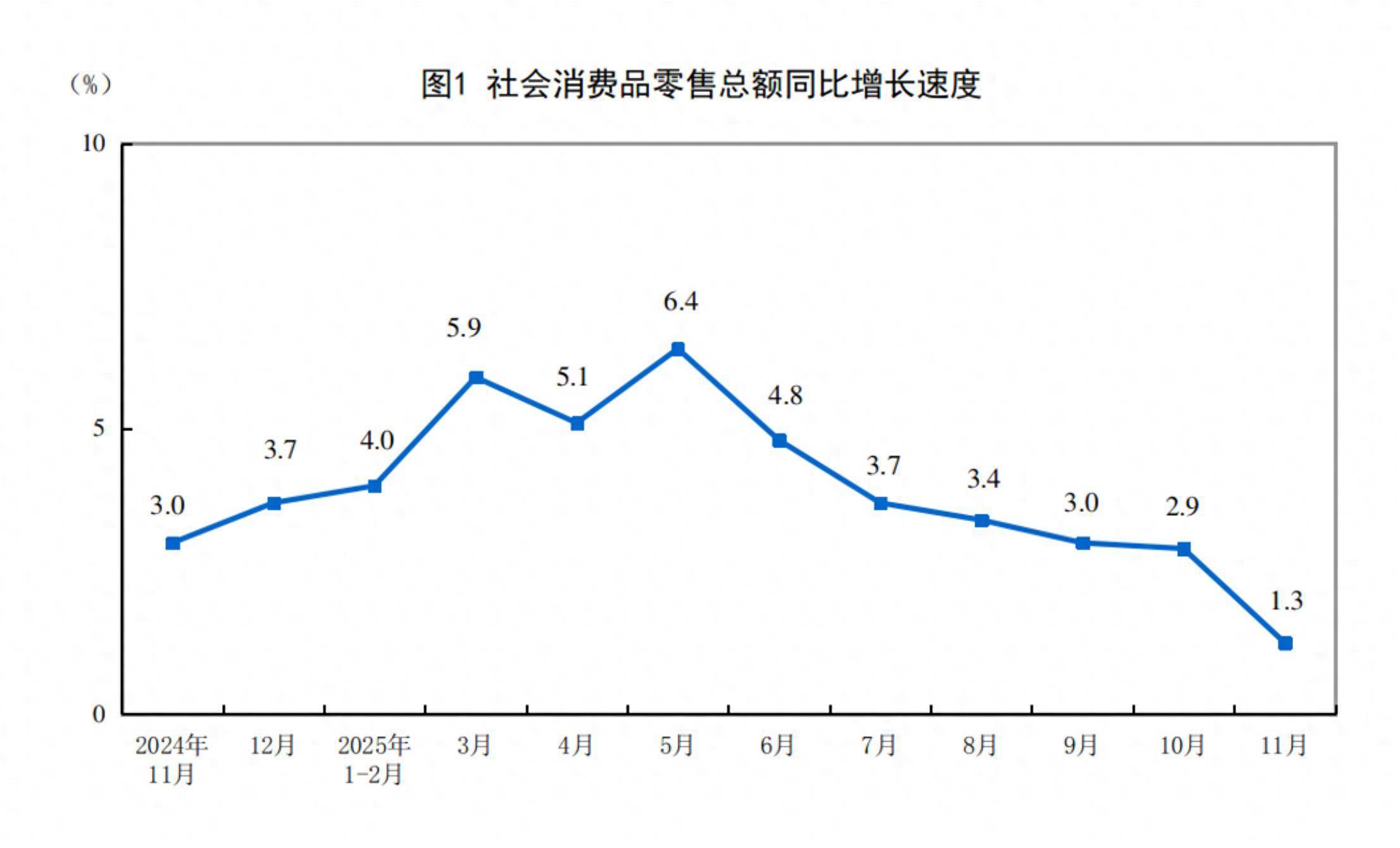 11月份,社会消费品零售总额43898亿元,同比增长1.3%。其中,除汽车以外的消费品零售额39444亿元,增长2.5%。1—11月份,社会消费品零售总额456067亿元,增长4.0%。其中,除汽车以外的消费品零售额411637亿元,增长4.6%。