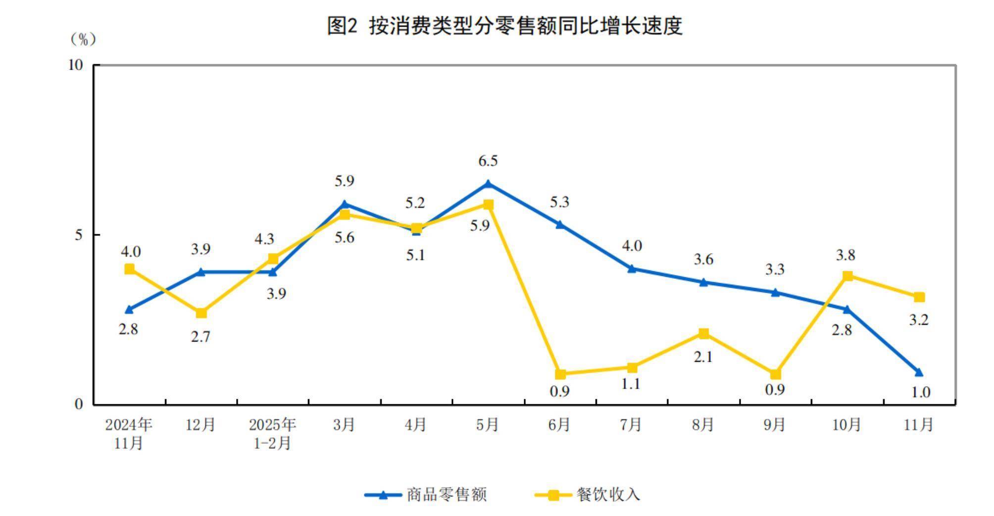 按消费类型分,11月份,商品零售额37841亿元,同比增长1.0%;餐饮收入6057亿元,增长3.2%。1—11月份,商品零售额403822亿元,增长4.1%;餐饮收入52245亿元,增长3.3%。