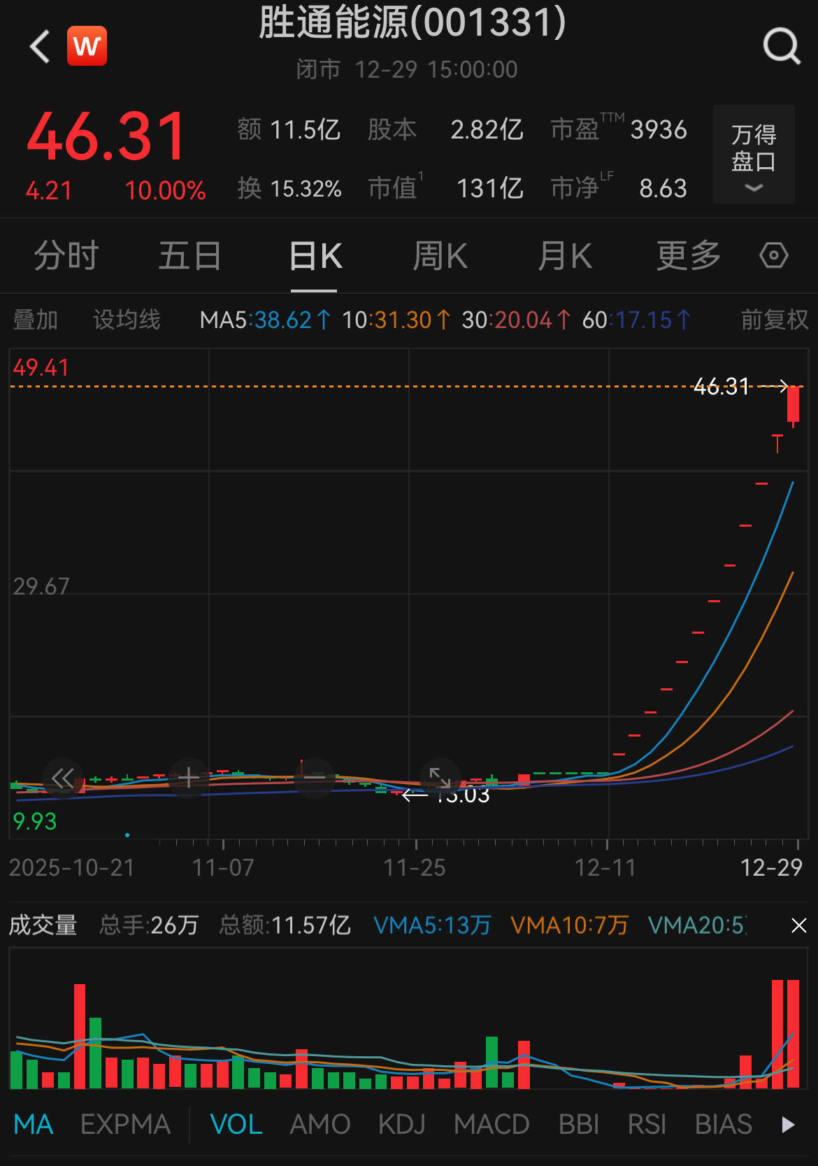 【大河财立方消息】12月29日,胜通能源发布公告称,公司股票价格自2025年12月12日至2025年12月29日期间价格涨幅为213.97%,期间多次触及股票交易异常波动情形,公司股票短期内价格涨幅较大,已严重背离公司基本面,为维护投资者利益,公司将就股票交易波动情况进行停牌核查。