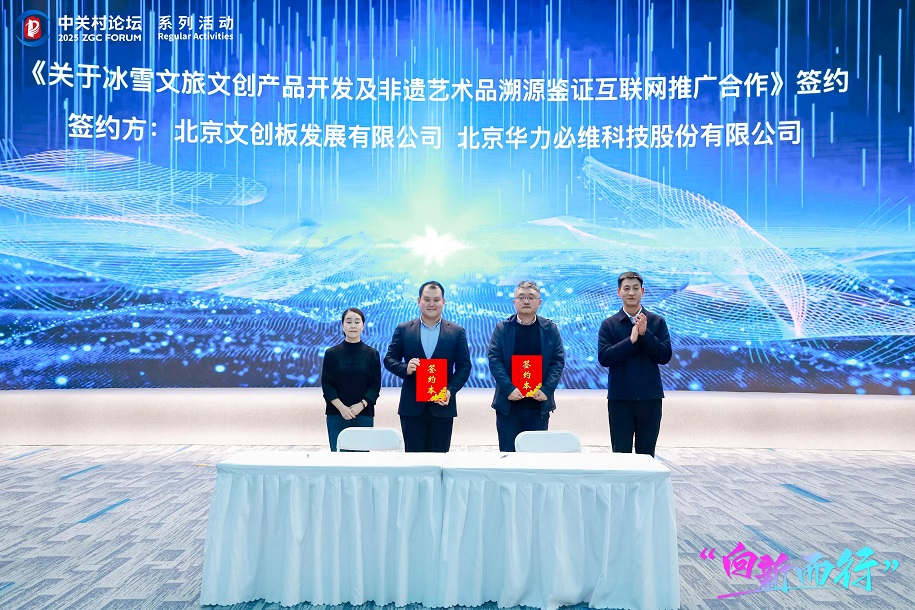 活动现场举行了两项重磅合作签约仪式,总金额超一亿元。北京文创板发展有限公司与北京华力必维科技股份有限公司,就“冰雪文旅文创产品开发及非遗艺术品溯源鉴证互联网推广”项目签约,该项目纳入Pre-Reits基金储备,预计三年实现价值超2亿元。
